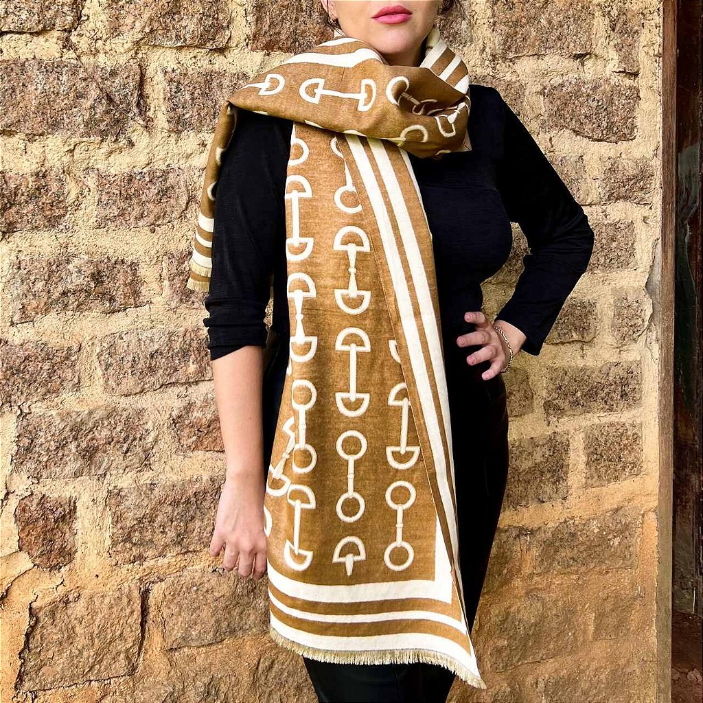 Com estampa delicada de bridão, este echarpe é perfeito para quem busca um visual refinado com um toque de originalidade.