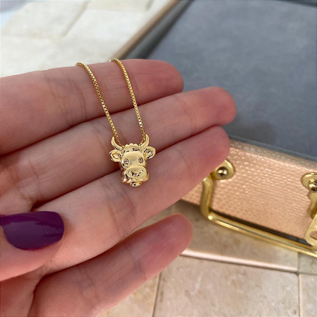 Colar feminino com pingente de vaca mini, banhado a ouro 18K. Uma joia delicada e charmosa, perfeita para mulheres que amam o estilo country e o universo rural com elegância.